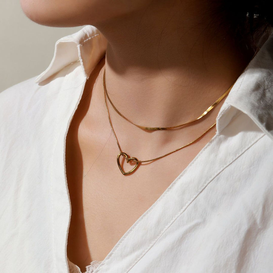 Features a twisted open-heart pendant paired with a smooth herringbone chain
